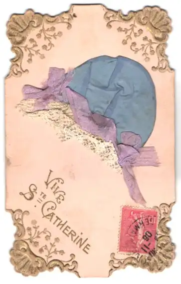Präge-AK Vive Ste. Chatherine mit Prägerand mit Haube aus echtem Stoff