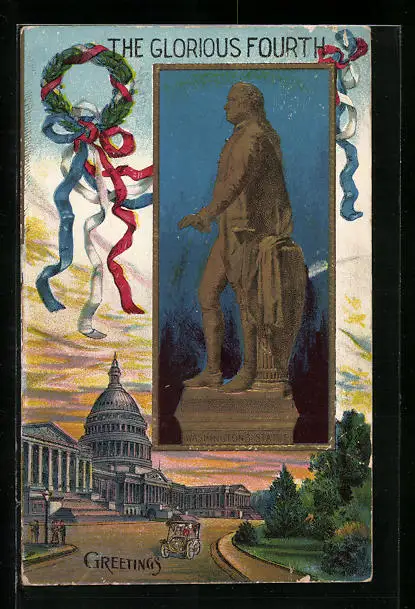 Präge-AK Wahingtons Statue, Präsident der USA, Passepartout