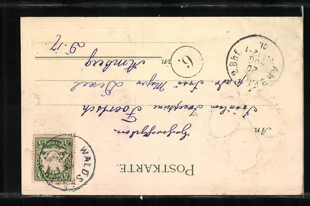 Personenbezogene Daten auf der Rückseite der Karte wurden durch blauen Textmarker unkenntlich gemacht. Die blauen Stellen sind auf die Vorderseite durchgeweicht und wirken sich negativ auf das Postkartenfoto aus