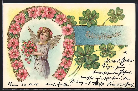 Präge-AK Weihnachtsengel mit Hufeisen und Kleeblättern