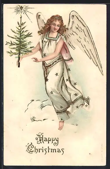 Präge-AK Weihnachtsengel trägt einen Weihnachtsbaum
