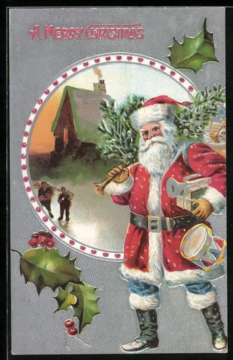 Präge-AK Weihnachtsmann mit Musikinstrumenten vor einem Wohnhaus