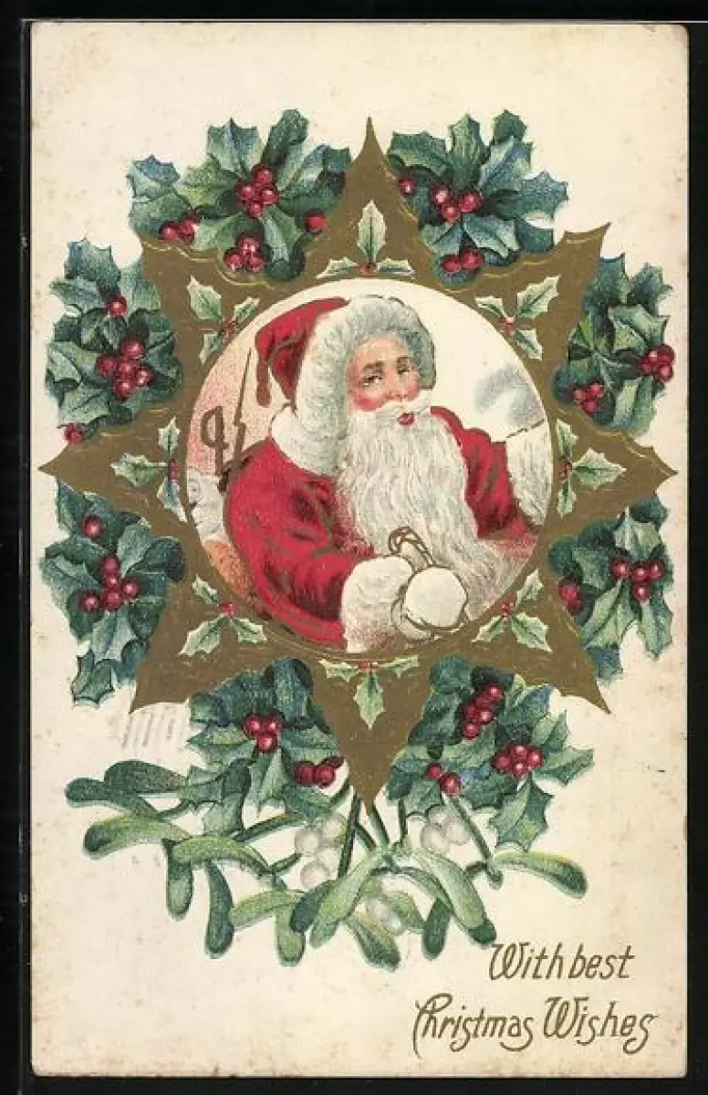 Präge-AK Weihnachtsmann mit Stechpalmenzweigen und Mistelzweigen