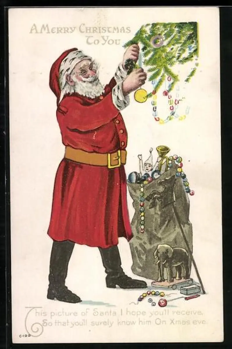 Präge-AK Weihnachtsmann schmückt einen Weihnachtsbaum, A merry Christmas to you