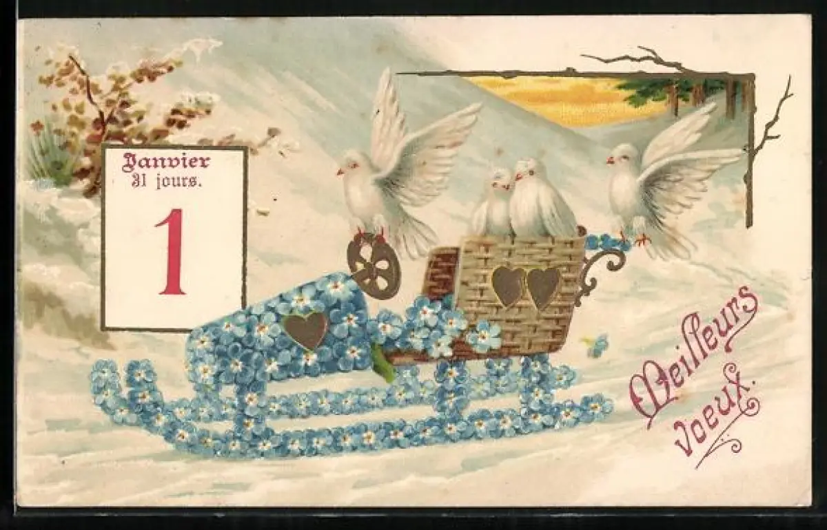 Präge-AK Weisse Tauben auf Schlitten aus Vergissmeinnicht, Neujahrsgruss