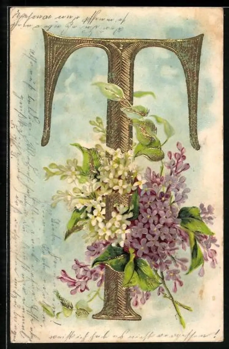 Präge-AK Weisse und violette Blumen am Buchstaben T