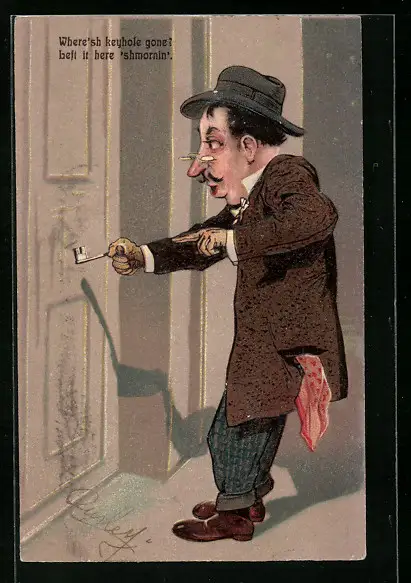 Präge-AK Where`sh keyhole gone? Left it here `shmornin`, Betrunkener sucht das Schlüsselloch