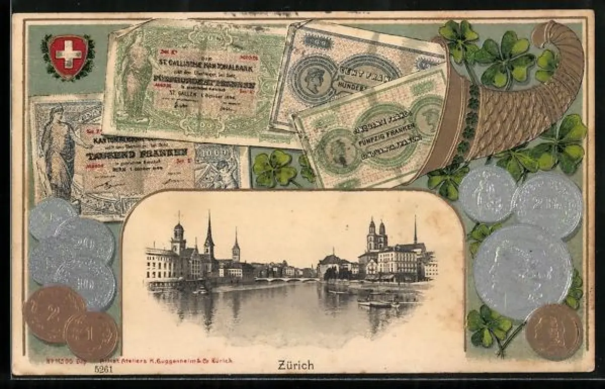 Präge-AK Zürich, Schweizer Franken mit Füllhorn, Klee und Teilansicht der Stadt