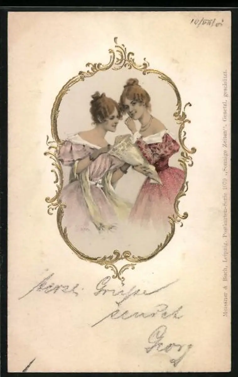 Präge-AK Zwei Damen in Kleider im Jugendstil-Rahmen