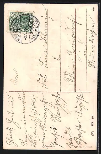 Personenbezogene Daten auf der Rückseite der Karte wurden durch blauen Textmarker unkenntlich gemacht. Die blauen Stellen sind auf die Vorderseite durchgeweicht und wirken sich negativ auf das Postkartenfoto aus