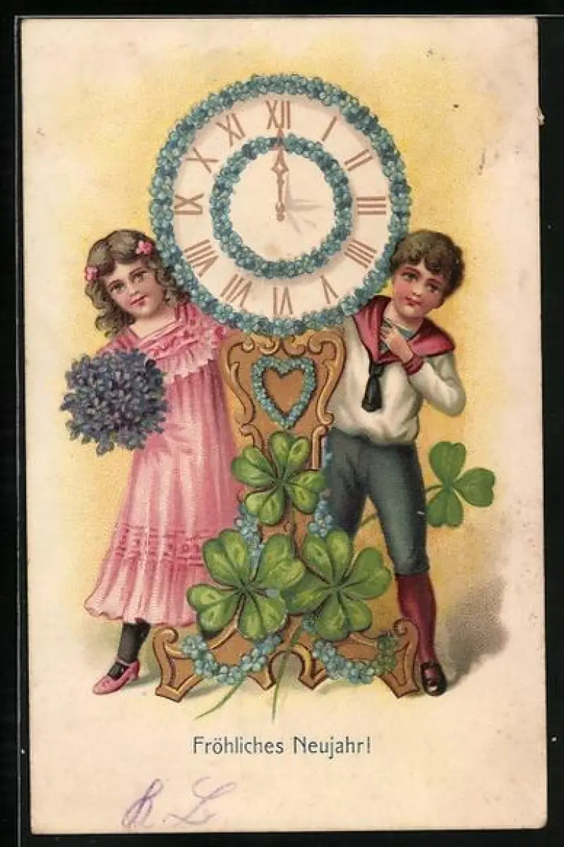 Präge-AK Zwei Kinder bei einer Uhr zu Mitternacht, Klee und Vergissmeinnicht, Fröhliches Neujahr