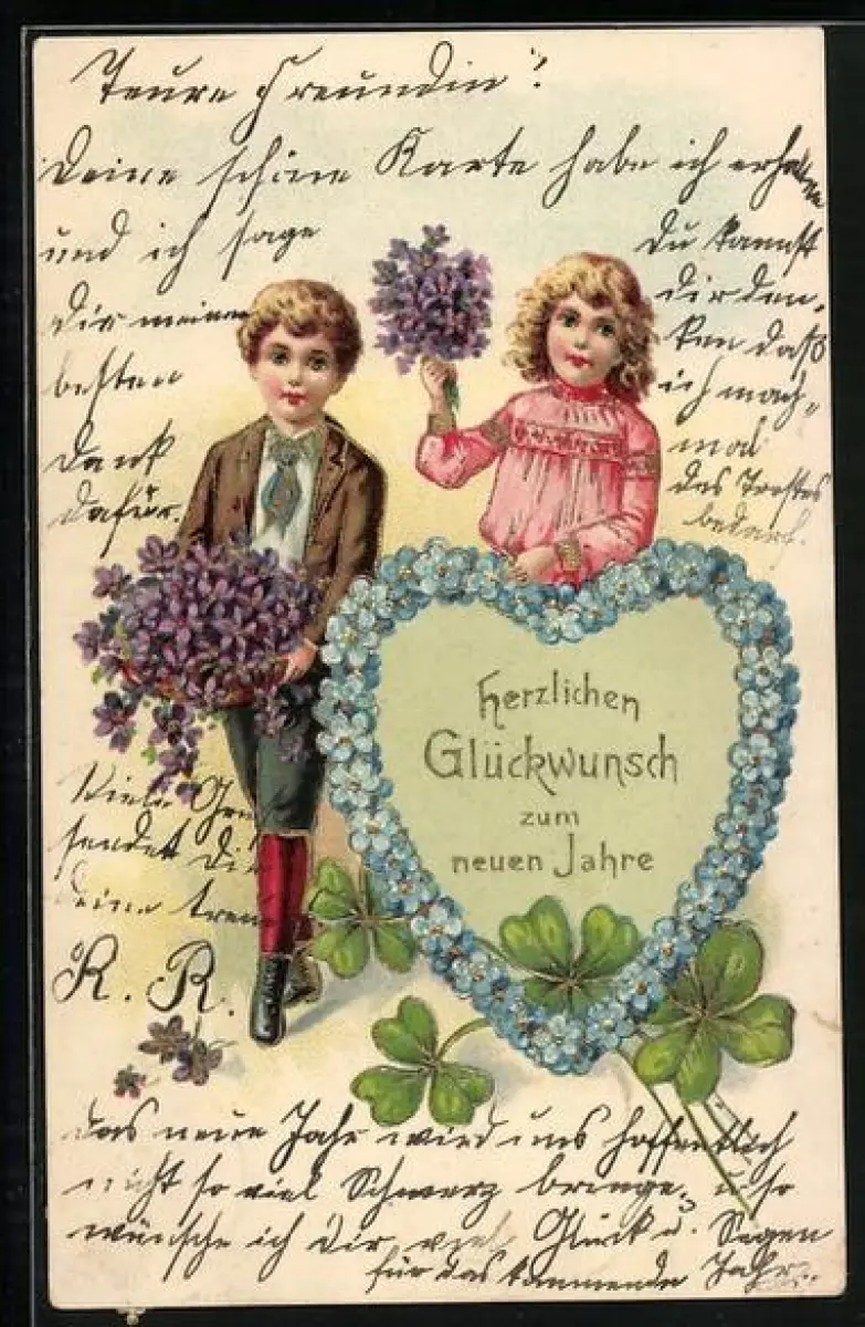 Präge-AK Zwei Kinder mit einem Herz aus Vergissmeinnicht und Veilchensträussen, Klee, Neujahr