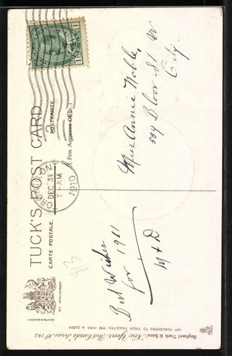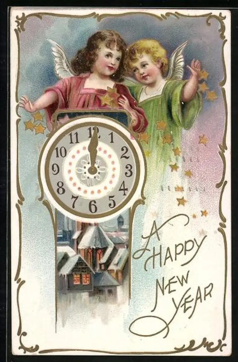 Präge-AK Zwei Neujahrsengel über einer Uhr zu Mitternacht, A Happy New Year