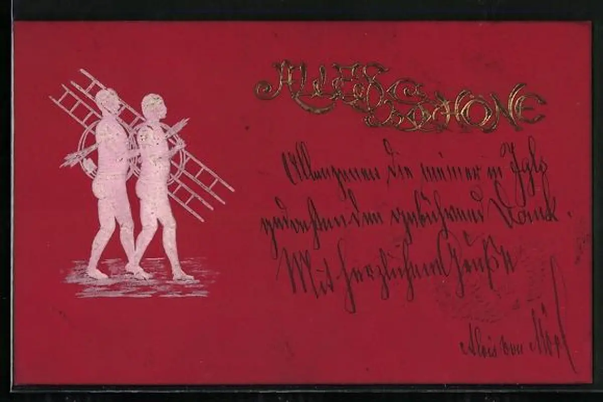 Präge-AK Zwei Schornsteinfeger auf rotem Hintergrund, Alles Schöne