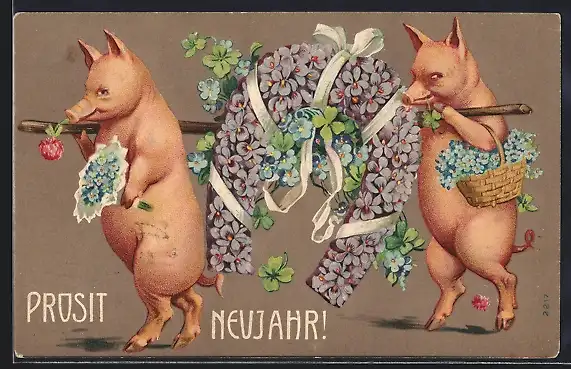 Präge-AK Zwei Schweine mit Blumen-Hufeisen an einer Stange, Vergissmeinnicht, Neujahrsgruss