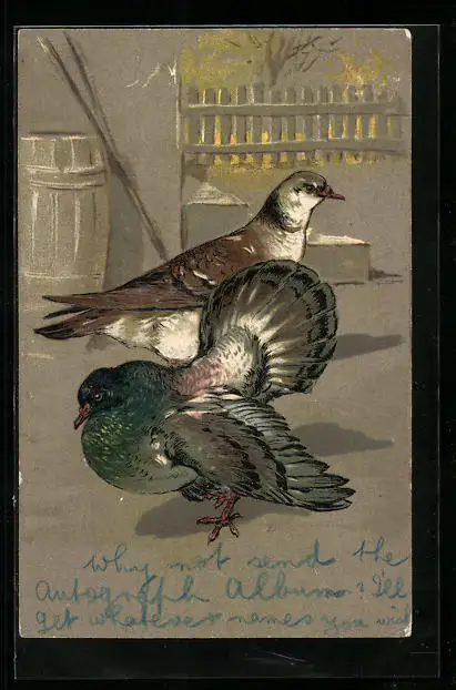 Präge-AK Zwei Tauben mit unterschiedlichem Gefieder in einem Hof