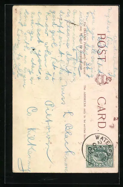 Personenbezogene Daten auf der Rückseite der Karte wurden durch blauen Textmarker unkenntlich gemacht. Die blauen Stellen sind auf die Vorderseite durchgeweicht und wirken sich negativ auf das Postkartenfoto aus