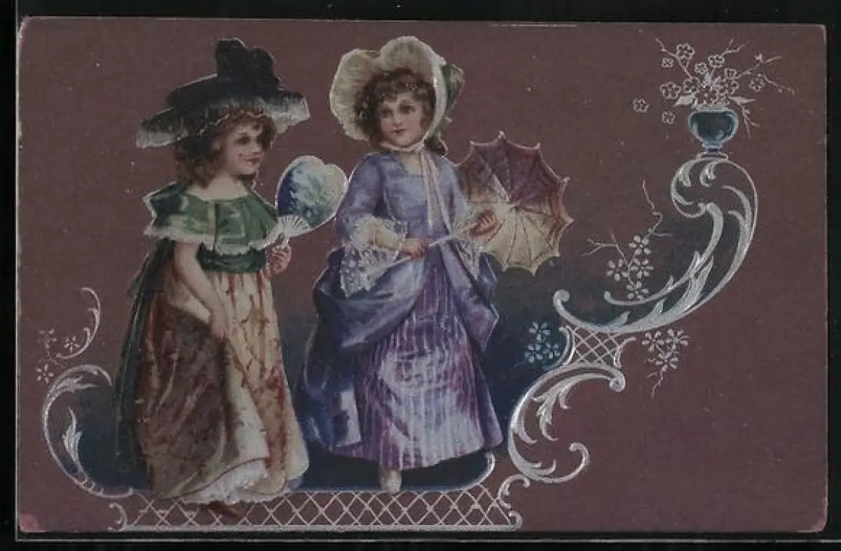 Präge-AK Zwei junge Damen mit Fächer, Sonnenschirm und Jugendstil-Verzierungen
