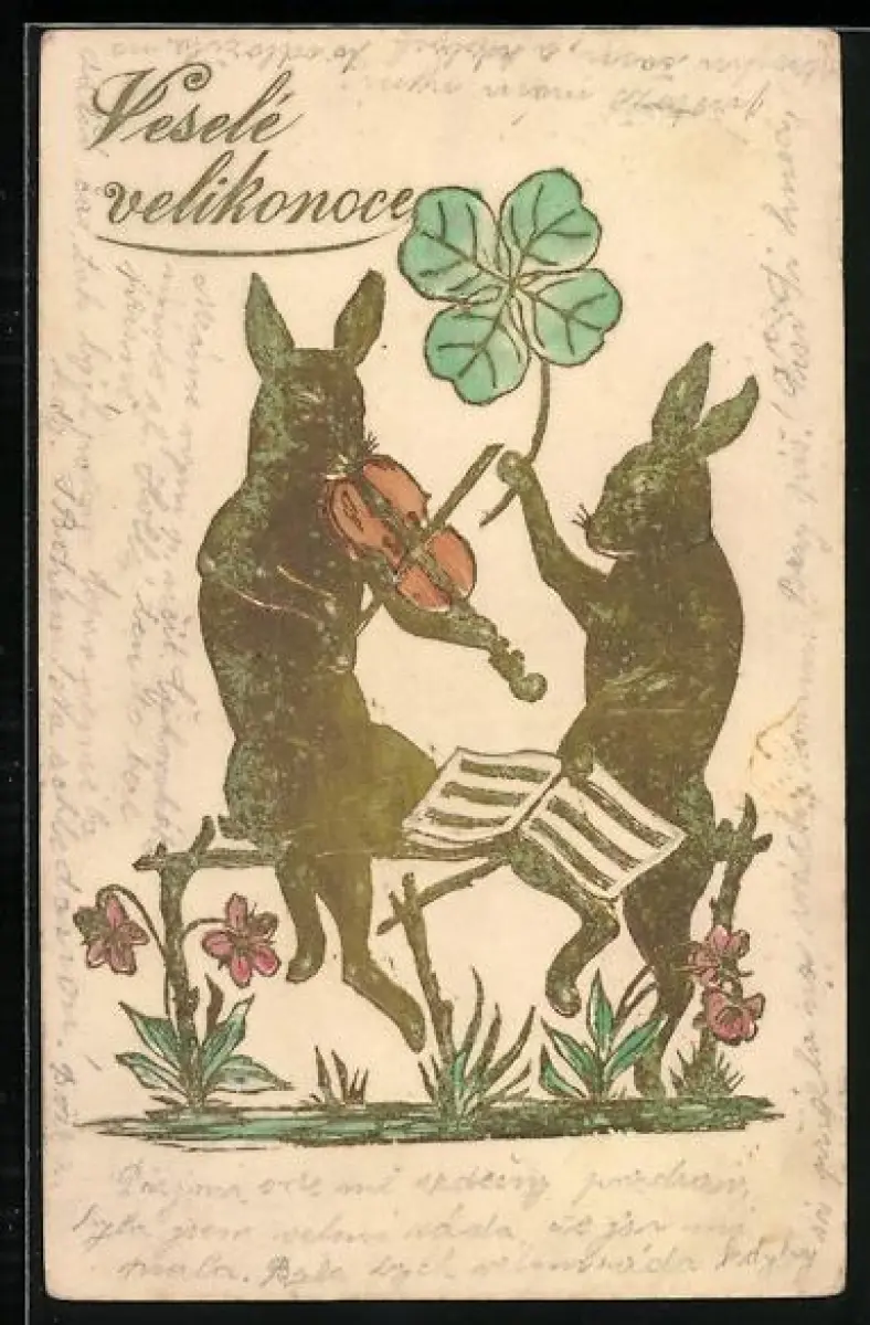 Präge-AK Zwei musizierende Osterhase mit Klee, Vesele velikonoce
