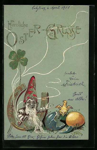 Präge-AK Zwerg im Hufeisen mit qualmender Pfeife