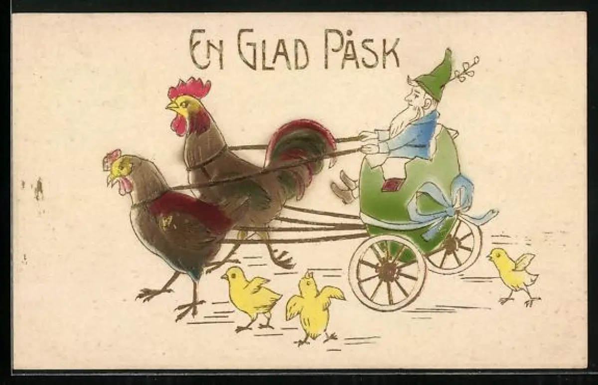 Präge-AK Zwerg in einer Kutsche, die von Hühners gezogen wird mit Osterküken, En Glad Pask