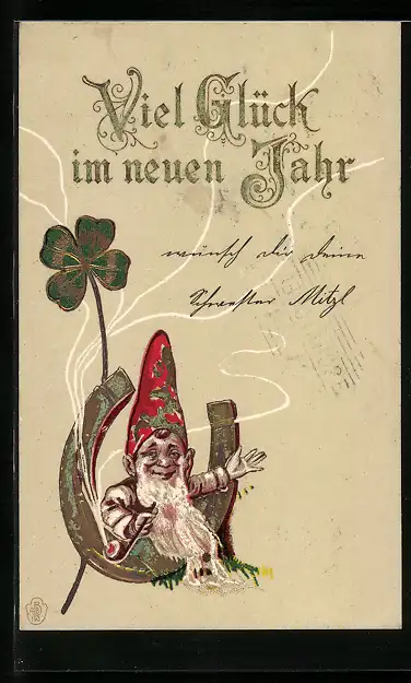 Präge-AK Zwerg raucht Pfeife in einem Hufeisen zu Neujahr