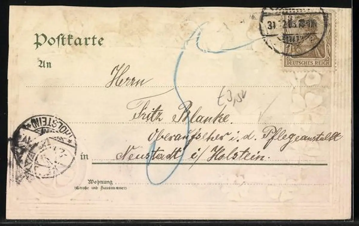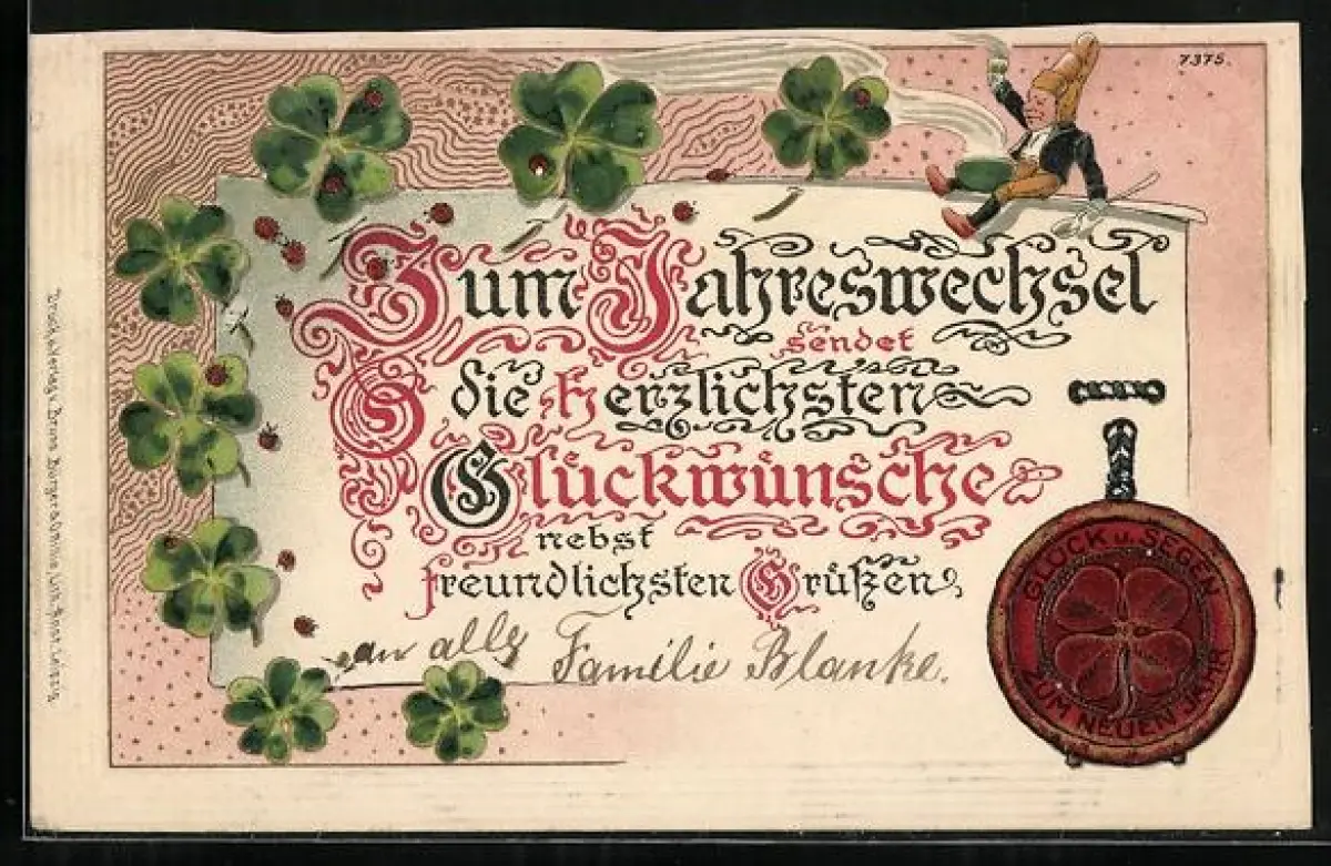 Präge-AK Zwerg sitzt auf einer Urkunde mit Siegel, Neujahrsgruss, Kleeblätter