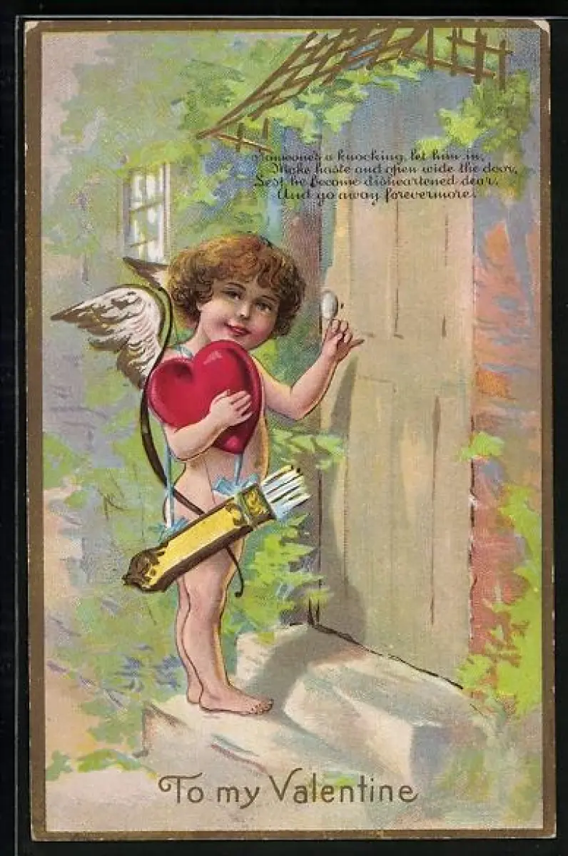 Präge-Künstler-AK To my Valentine, Amor klopft mit Herz im Arm an Tür