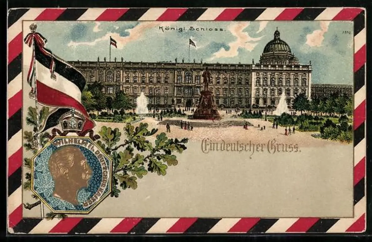 Präge-Lithographie Berlin, Königliches Schloss, Denkmal, Reichsflagge und Profil Kaiser Wilhelms II.