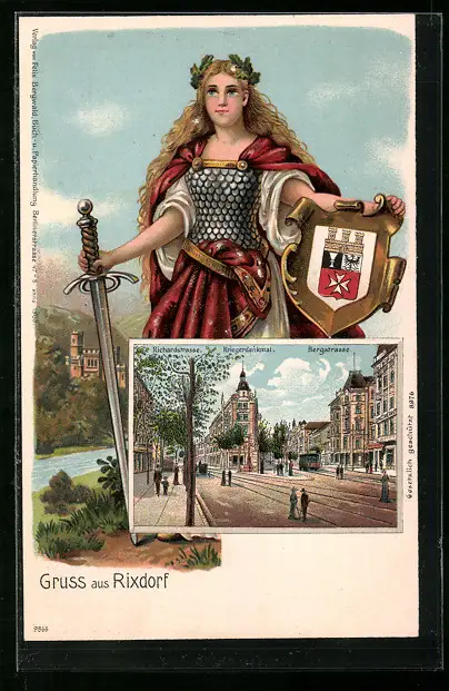 Präge-Lithographie Berlin-Neukölln, Kriegerdenkmal Richard- Ecke Bergstrasse, Germania mit Schwert u. Wappenschild