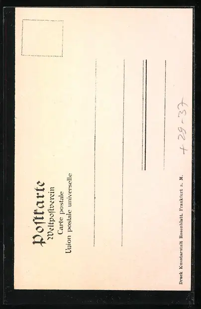 Personenbezogene Daten auf der Rückseite der Karte wurden durch blauen Textmarker unkenntlich gemacht. Die blauen Stellen sind auf die Vorderseite durchgeweicht und wirken sich negativ auf das Postkartenfoto aus