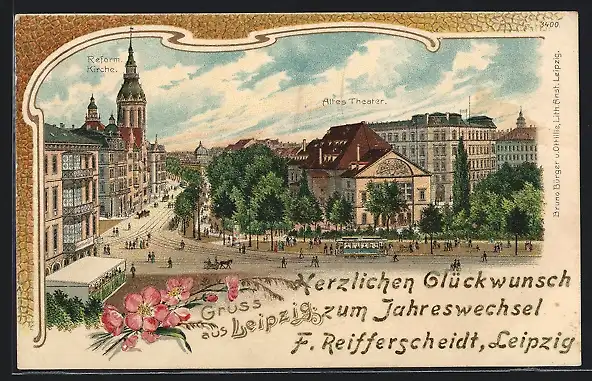 Präge-Lithographie Leipzig, Strassenpartie mit altem Theater, Reform-Kirche und Strassenbahn, Neujahrsgruss