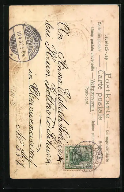 Personenbezogene Daten auf der Rückseite der Karte wurden durch blauen Textmarker unkenntlich gemacht. Die blauen Stellen sind auf die Vorderseite durchgeweicht und wirken sich negativ auf das Postkartenfoto aus