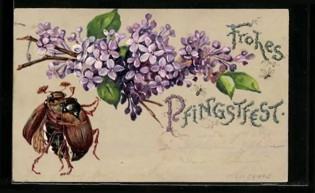 Präge-Lithographie Maikäferpaar tanzt unter Fliederblüten, Pfingstgruss