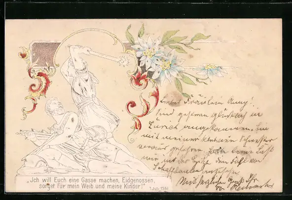 Präge-Lithographie Schweiz, Ich will Euch eine Gasse machen, Eidgenossen, sorget für mein Weib und meine Kinder
