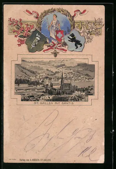 Präge-Lithographie St. Gallen, Ortsansicht mit Säntis, Wappen