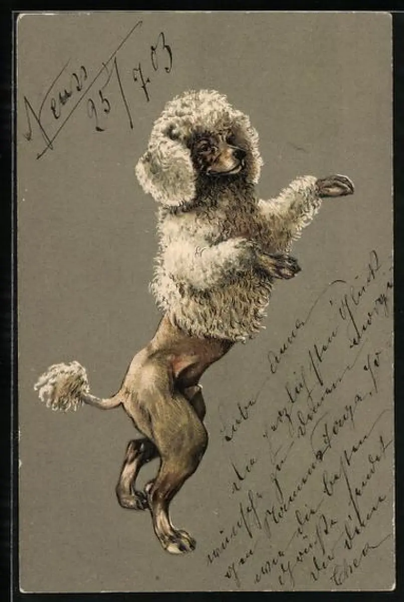 Präge-Lithographie Weisser Pudel, auf den Hinterpfoten stehend
