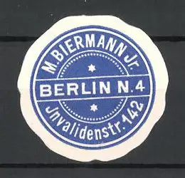 Präge-Reklamemarke M. Biermann Jr., Invalidenstr. 142, Berlin