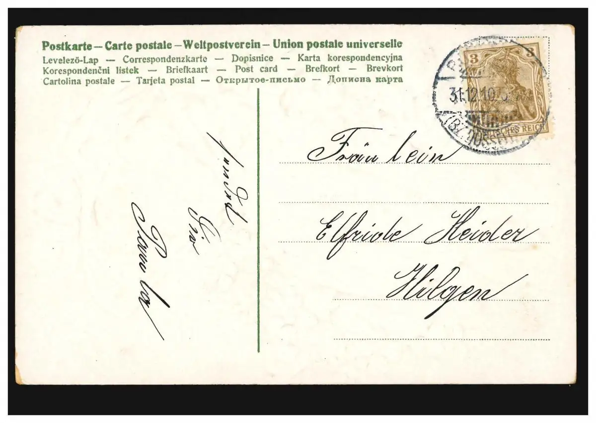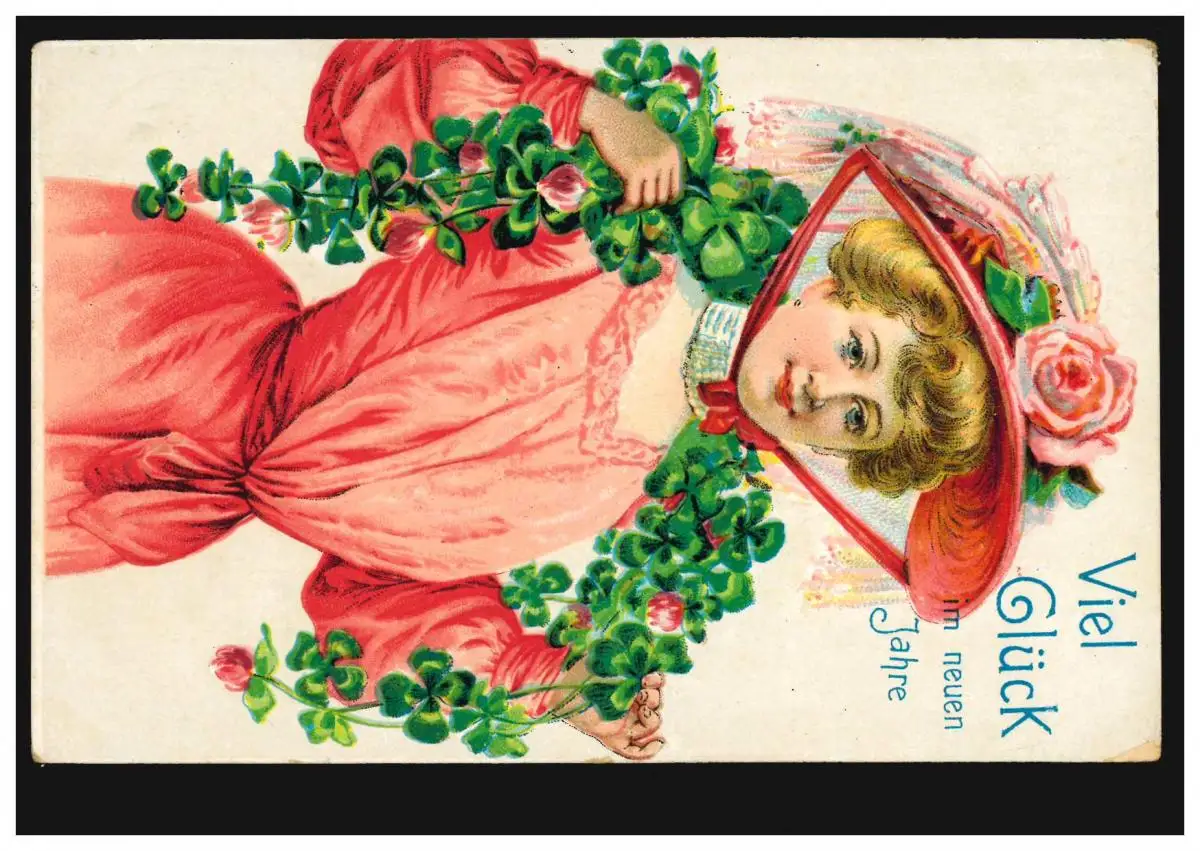 Prägekarte Neujahr Frau in rotem Kleid mit Glücksklee, BURSCHEID 31.12.1910
