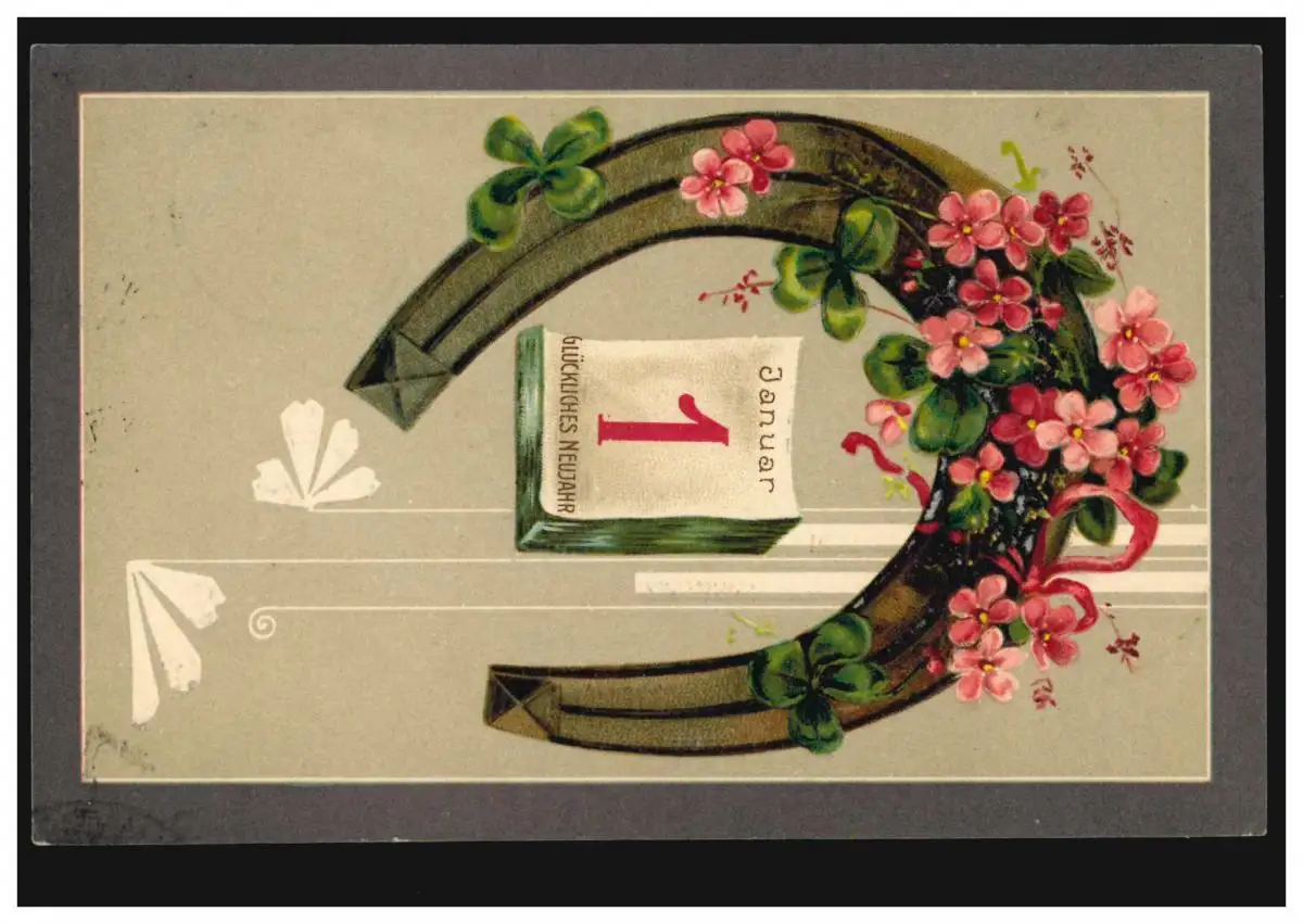 Prägekarte Neujahr Kalenderblatt 1.Januar Hufeisen, WILMERSDORF bei BERLIN 1908