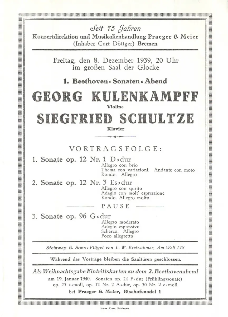 Freitag, den 8. Dezember 1939, 20 Uhr im großen Saal der Glocke. GEORG KULENKAMPFF, Violine / SIEGFRIED SCHULTZE, Klavier. Vortragsfolge: 1. Sonate op. 12 Nr. 1 D=dur / 2. Sonate op 12 Nr. 3 Es=dur / 3. Sonate op. 96 G=dur - Theaterprogramm, Opernprogramm, Ballettprogramm, Musicalprogramm, Konzertprogramm, Theatermemorabilia, Programmhefte Sammlung, deutsche Theatergeschichte.