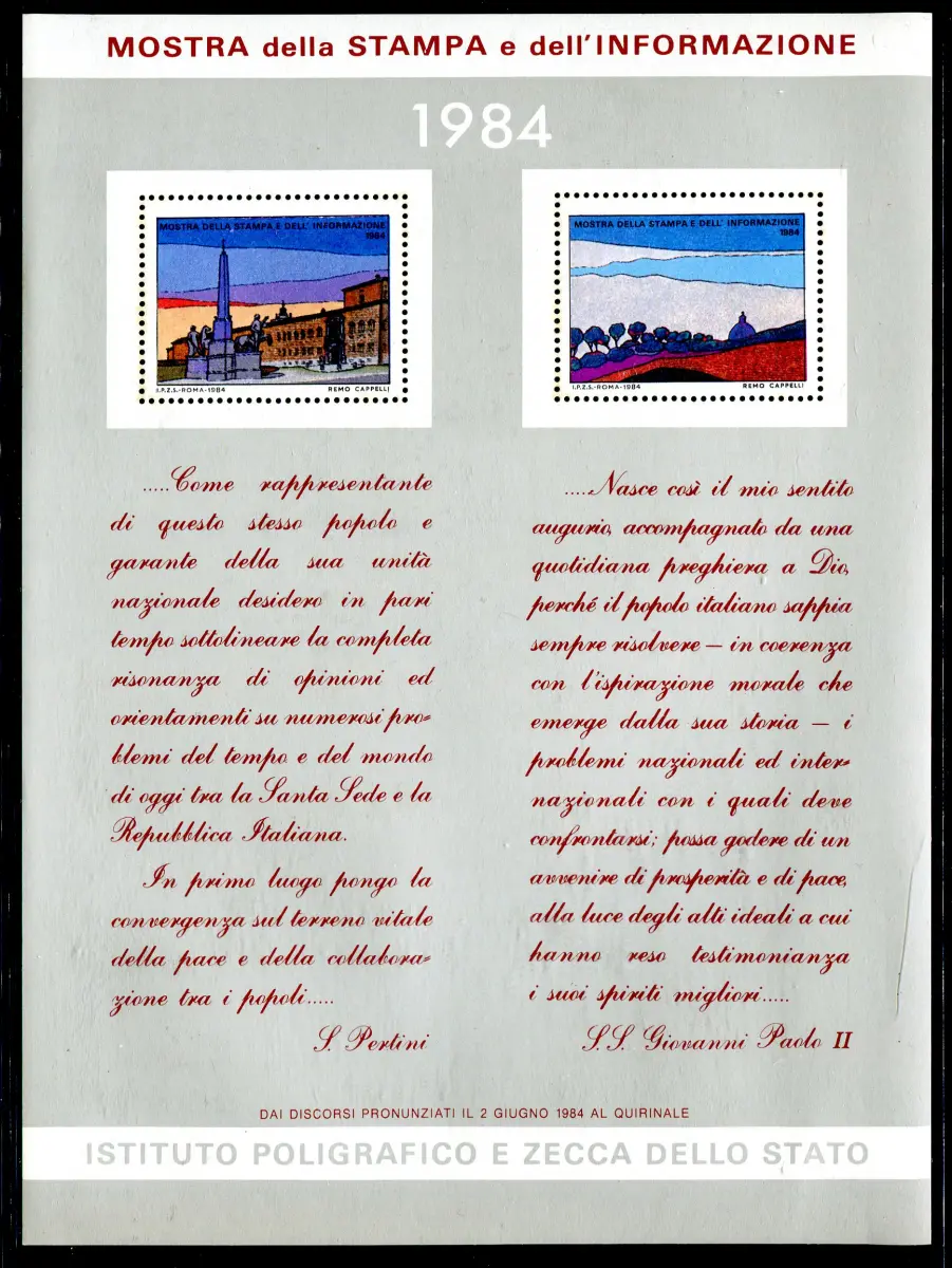 Vollgummi - Erinnerungsblatt zur Presse- und Informationsausstellung von 1984 gibt einen Teil der Reden von Präsident Pertini und SS Johannes Paul II. wieder - gedruckt von der Staatspolygraphie in limitierter Auflage - ungewöhnlich - Nr. 11/WEB