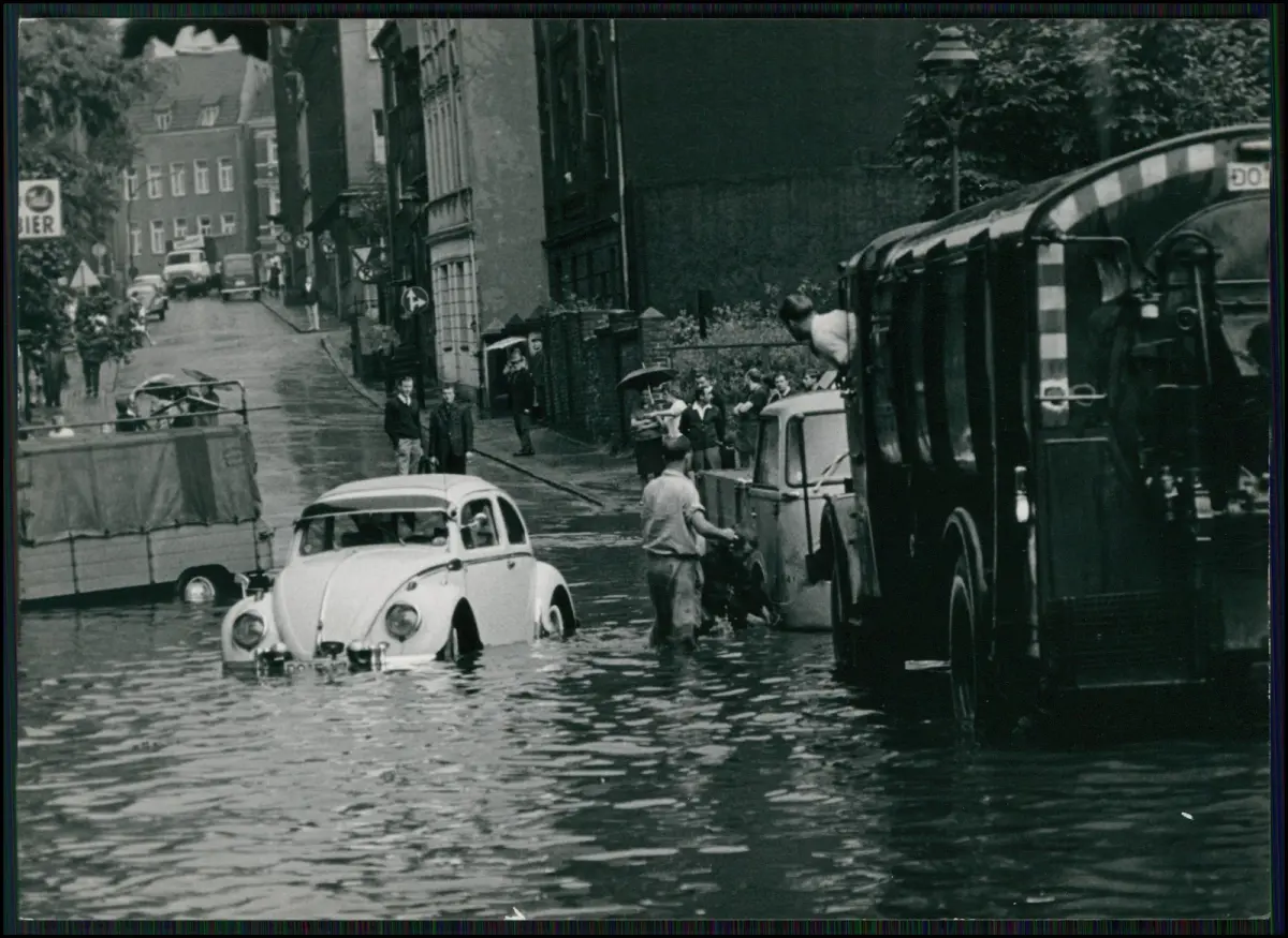 Motiv Mehrere Autos im Hochwasser, darunter ein VW Käfer, ein Transporter und ein städtisches Einsatzfahrzeug; Anwohner und Helfer waten durch das Wasser, zahlreiche Schaulustige beobachten die Szene.