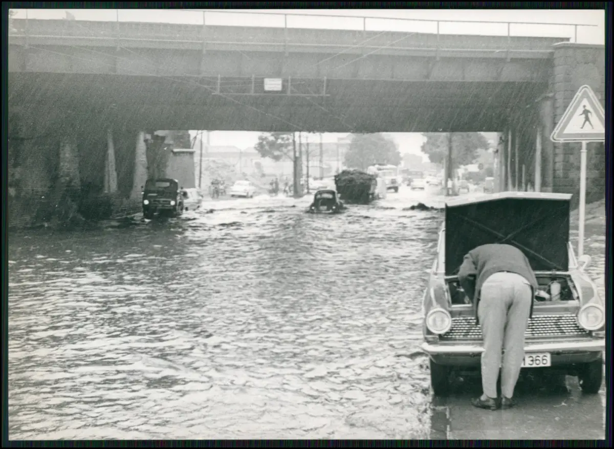 Motiv Mehrere Fahrzeuge im hohen Wasserstand, ein geöffneter Motorraum, starke Strömung und typische Verkehrsführung der City.
