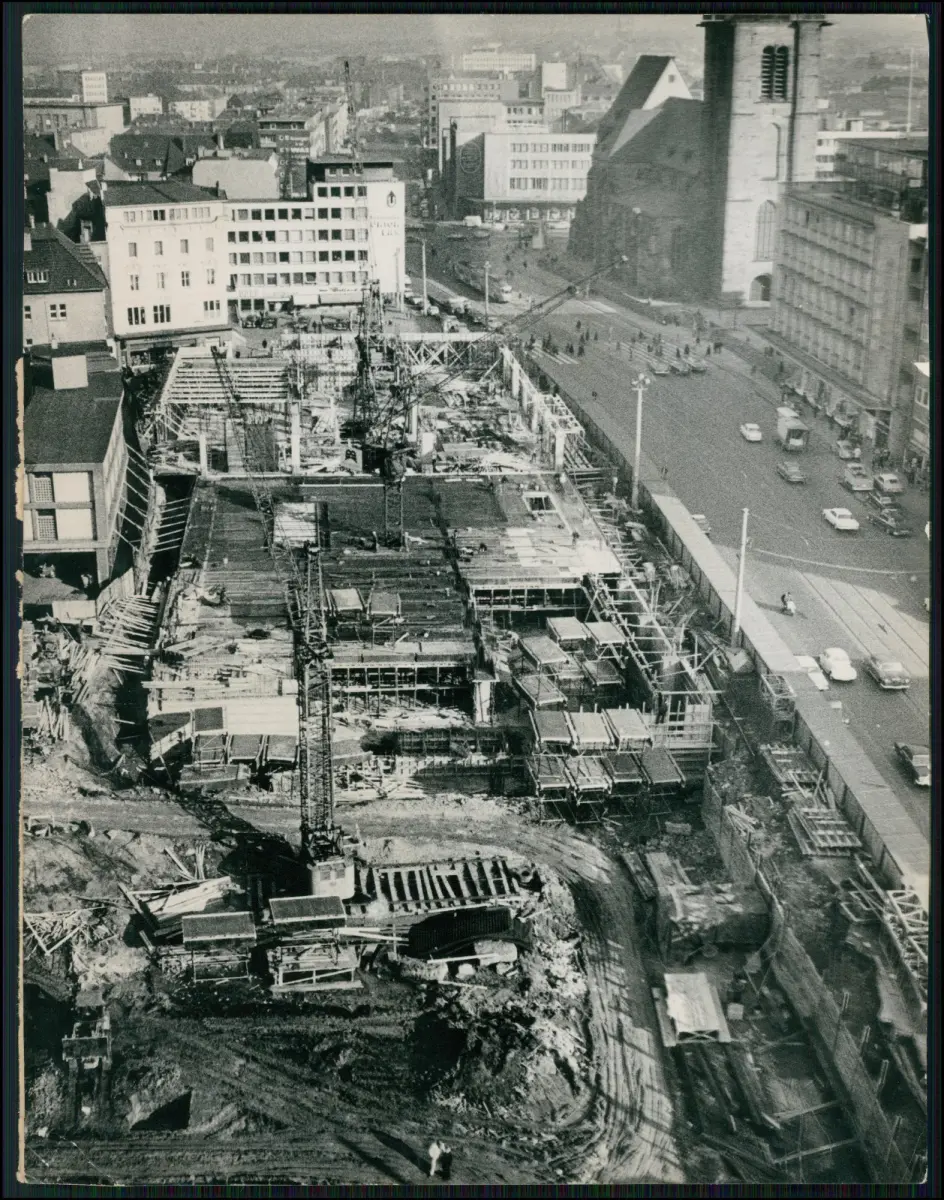 Dortmund im Wiederaufbau der 1950er Jahre mit Blick auf die Reinoldikirche und das entstehende neue Stadtzentrum. Die Aufnahme zeigt die großflächigen Bauarbeiten während der städtebaulichen Neugestaltung nach dem Zweiten Weltkrieg. Die Reinoldikirche gilt als eines der bedeutendsten Bauwerke der Stadt und prägt seit dem Mittelalter das Zentrum. Laut allgemein bekannten historischen Quellen wurde der Bereich um die Kirche nach Kriegszerstörungen umfassend neu geplant und bebaut.
