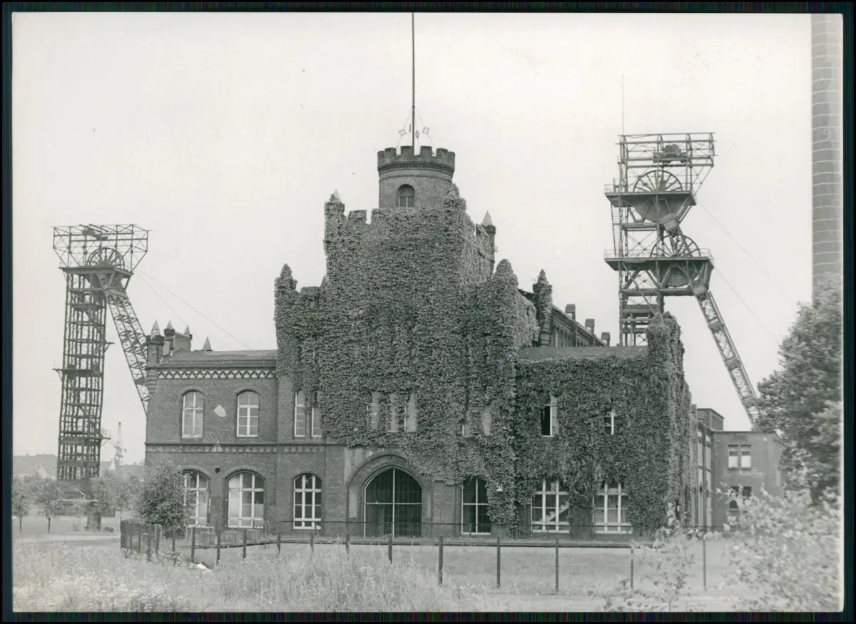 Das Bild zeigt die Zeche Adolf von Hansemann mit ihrem imposanten Hauptgebäude, dem turmartigen Mittelbau und den beiden charakteristischen Fördergerüsten.