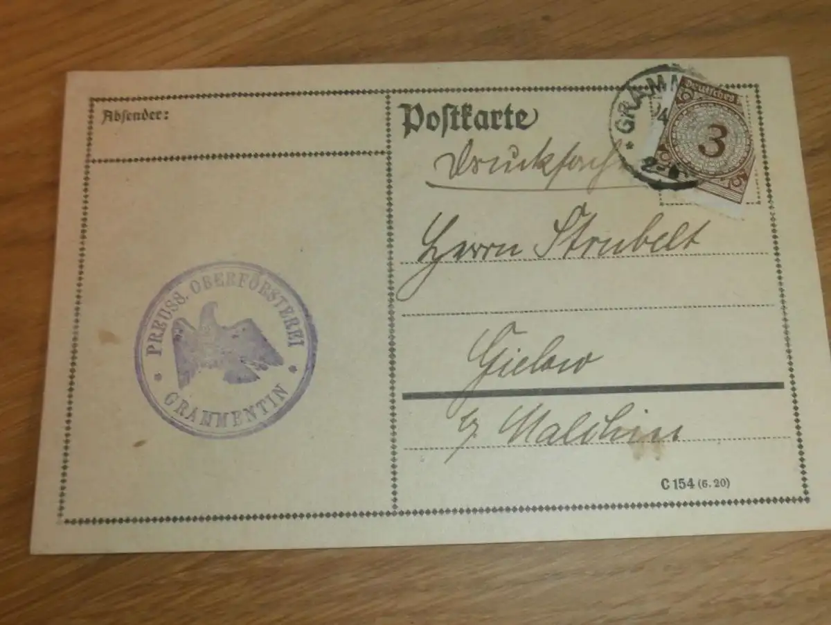 Preuss. Oberförsterei in Grammentin i. Pommern , 1924 , Forst , Jagd , mit Marke , altes Dokument !!