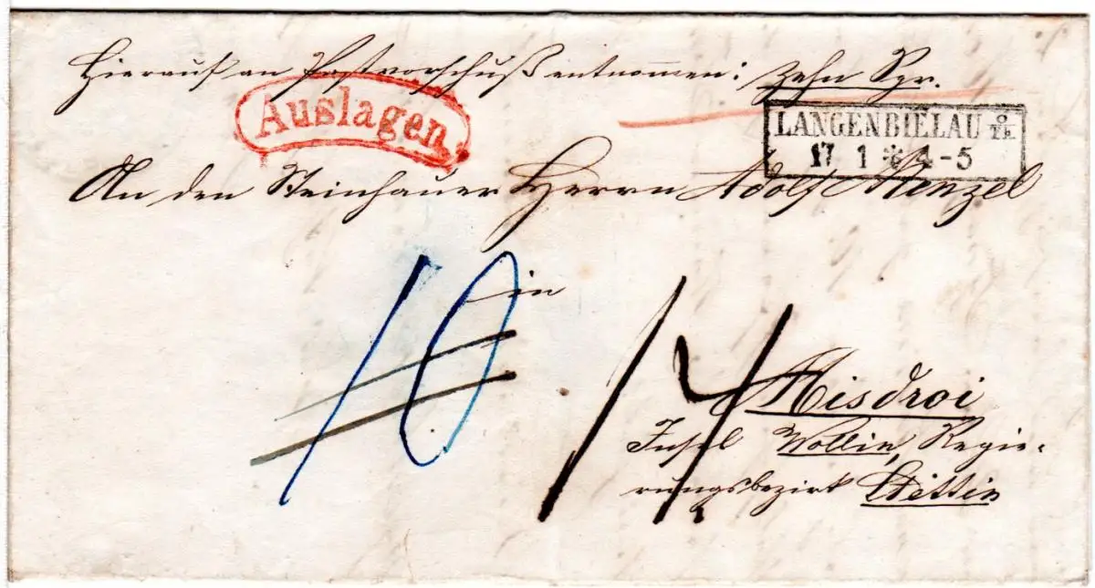 Preussen 1859, R2 LANGENBIELAU auf Brief m. rotem AUSLAGEN Stpl.