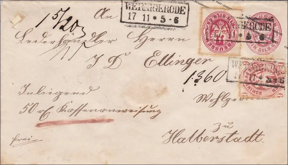 Preussen: Ganzsachenumschlag Wernigerode nach Halberstadt