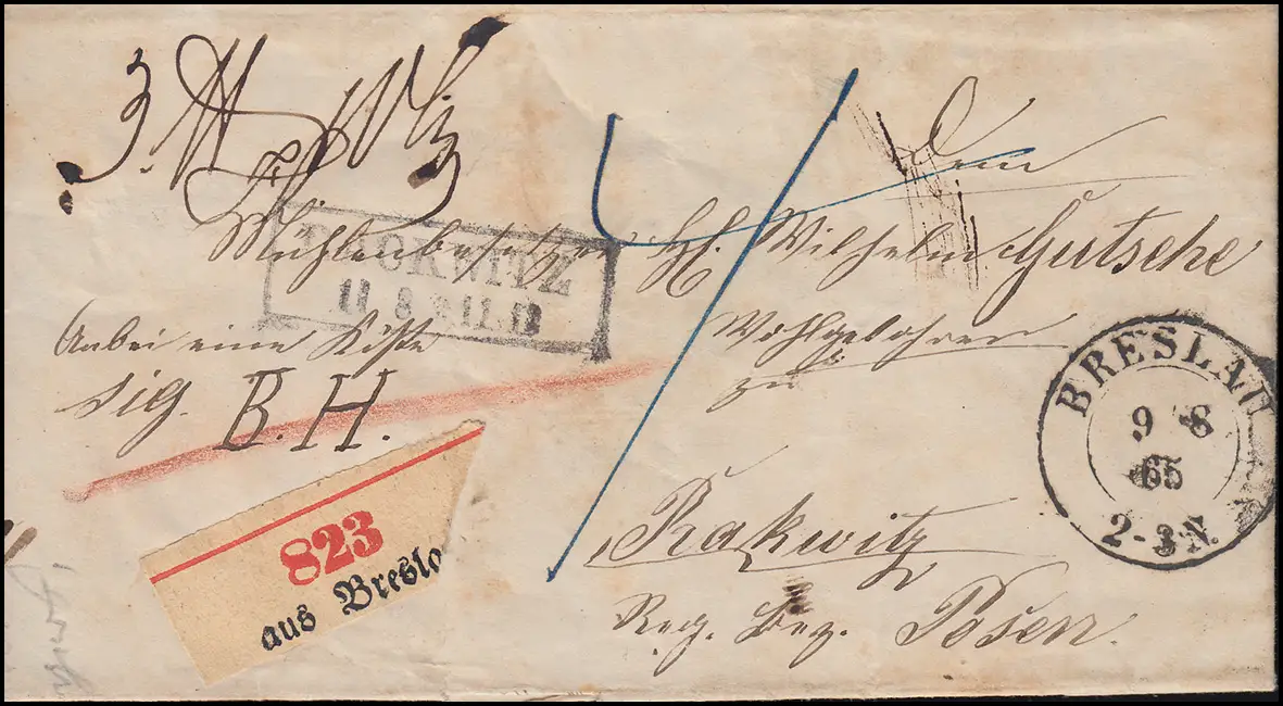 Preußen Paketbegeleitbrief Zweikreis BRESLAU 8.8.1865 nach RACKWITZ 11.8.